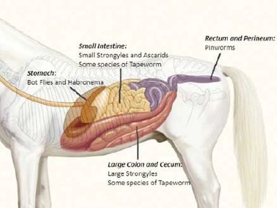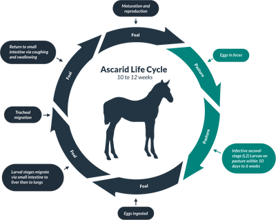 Ascarids are the GI parasite of greatest concern in young horses. High numbers of ascarids cause severe impactions and colic in foals and weanlings. Ascarid- associated colic occurs commonly in foals that have recently been dewormed but have little to no previous deworming history or in foals that have not been dewormed at all. When large numbers of ascarid worms are killed all at once, the intestines are "flooded" with dead worms and toxins from the die-off; this can create a large impaction. Because of this risk, frequent, appropriate deworming of foals is crucial.
