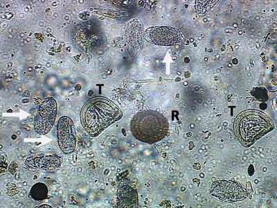 photo courtesy of: extension.usu.edu (T= tapeworm, Arrow= Strongyle/ Small Roundworm, R= Ascarid/ Large Roundworm